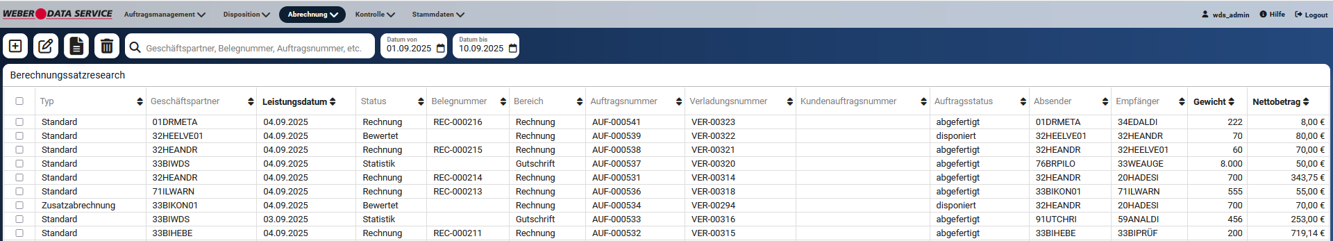 Um einen Berechnungssatz zur Abrechnung zu bringen, können Sie ihn direkt hier im Abrechnungsresearch markieren und den gewünschten Beleg über den Belege-Button auswählen. Sie können auch mehrere Berechnungssätze markieren und zusammen auf einen Beleg bringen, sofern die Sätze zum gleichen Geschäftspartner und gleichen Bereich gehören.
